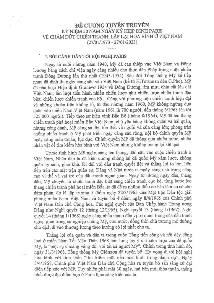Đề cương tuyên truyền KỶ NIỆM 50 NĂM NGÀY KÝ HIỆP ĐỊNH PARIS VỀ CHẤM DỨT CHIẾN TRANH, LẬP LẠI HÒA BÌNH Ở VIỆT NAM (27/01/1973 - 27/01/2023)
