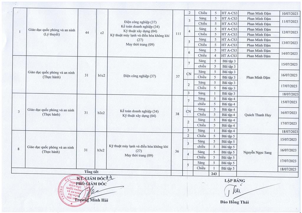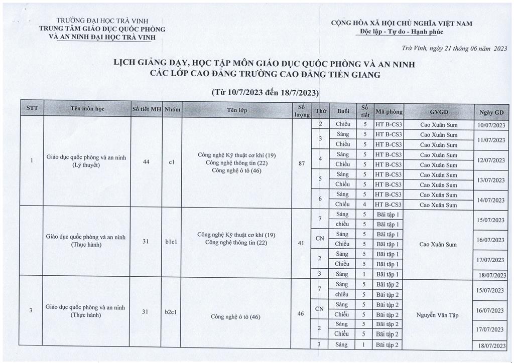 Lịch giảng dạy, học tập Môn Giáo dục Quốc phòng và An ninh các lớp Cao đẳng Trường Cao đẳng Tiền Giang (Từ 10/7 đến 18/7/2023)