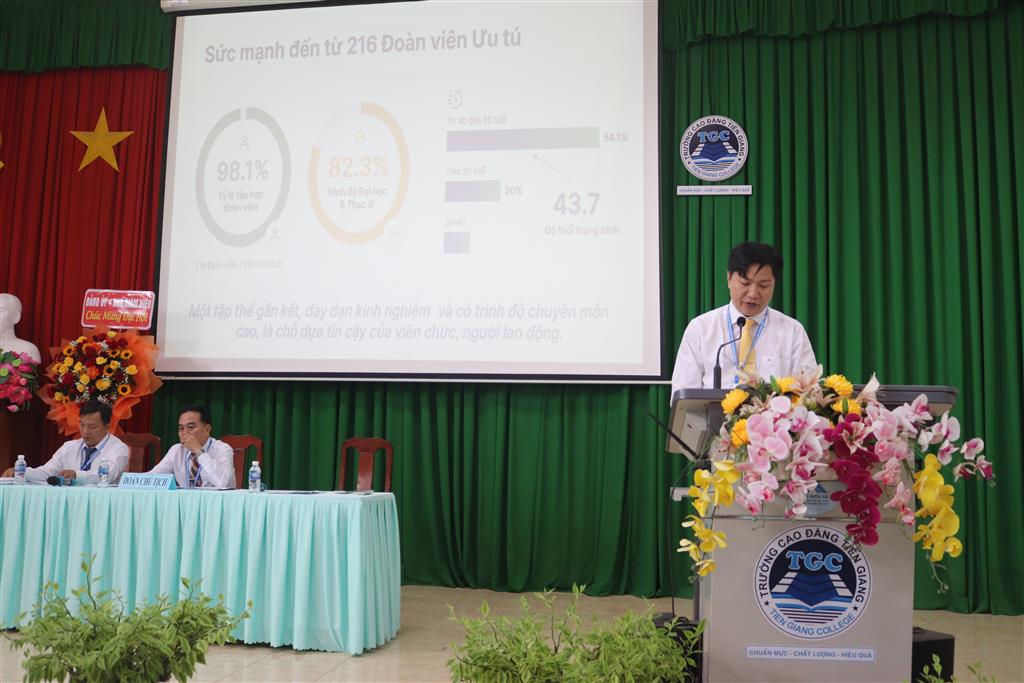 Đại diện Đảng ủy nhà trường, đồng chí Trương Thanh Nhường – Phó Bí Thư Đảng ủy, Chủ tịch hội đồng trường biểu dương, ghi nhận và đánh giá cao sự cố gắng nỗ lực của BCHCĐ và toàn thể VC-NLĐ trong nhà trường. Sự nỗ lực cố gắng đó đã góp phần củng cố, nâng cao vị thế của tổ chức công đoàn, đóng góp quan trọng vào thực hiện thắng lợi các nhiệm vụ chính trị của Trường Cao đẳng Tiền Giang. Đồng chí cam kết sẽ đồng hành và chỉ đạo trưởng phó các đơn vị thuộc trường cùng phối hợp chặt chẽ với các tổ trưởng công đoàn vận động VC-NLĐ phát huy vai trò làm chủ và tinh thần thần trách nhiệm của mình, tham gia thực hiện đạt và vượt các chỉ tiêu được đại hội biểu quyết thông qua. Cùng với đó, đồng chí thay mặt Đảng ủy – Ban giám hiệu nhà trường bày tỏ lời cảm ơn chân thành đến BCH Công đoàn viên chức tỉnh đã quan tâm sâu sát và kịp thời với hoạt động của CĐCS trường trong thời gian qua.