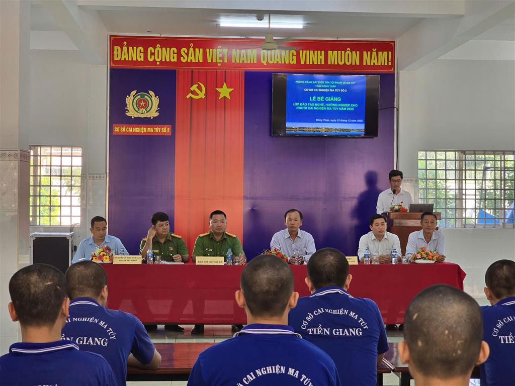Ngày 23/12/2025, Trường Cao đẳng Tiền Giang phối hợp với Cơ sở Cai nghiện ma túy số 02 tỉnh Đồng Tháp tổ chức Lễ bế giảng và công nhận tốt nghiệp nghề Điện dân dụng cho các học viên đang cai nghiện tại cơ sở. Tham dự buổi lễ có Trung tá Võ Thái Nam Đội trưởng Cơ sở cai nghiện ma túy số 02 Tỉnh Đồng Tháp; thầy Nguyễn Quang Khải – Hiệu trưởng Trường Cao đẳng Tiền Giang; các cán bộ, giáo viên tham gia giảng dạy và quản lý lớp, cùng với 36 học viên của lớp Điện dân dụng.