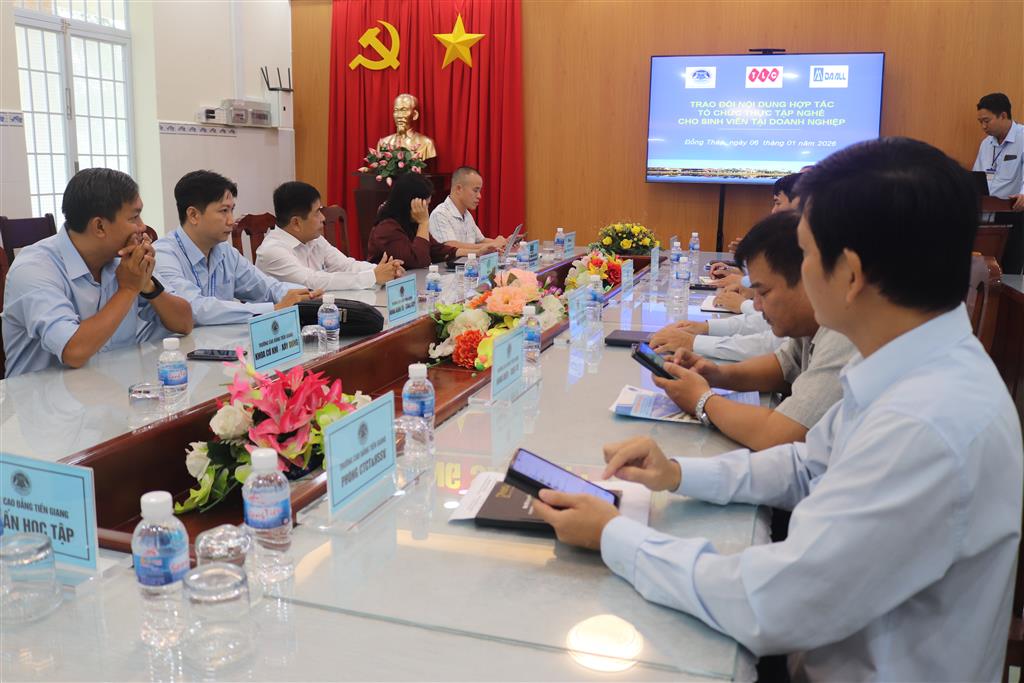 Ngày 06/01/2026, Trường Cao đẳng Tiền Giang đã tổ chức buổi gặp gỡ, trao đổi và ký kết thỏa thuận hợp tác đào tạo gắn với thực tập nghề nghiệp cho sinh viên với Công ty TNHH Đào tạo và Phát triển nguồn nhân lực TLC Việt Nam và Công ty TNHH DA ALL VINA. Buổi làm việc có sự hiện của thầy Nguyễn Quang Khải - Hiệu trưởng nhà trường; ông Phạm Công Sơn - Chủ tịch HĐQT Công ty TNHH Đào tạo và Phát triển nguồn nhân lực TLC Việt Nam, kiêm Giám đốc nhân sự Công ty TNHH DA ALL VINA; bà Trần Thị Tuyết Mai - Phó Giám đốc Công ty TNHH Đào tạo và Phát triển nguồn nhân lực TLC Việt Nam; cùng với các Trưởng, Phó các đơn vị thuộc trường và gần 20 học sinh, sinh viên đang học tại trường.